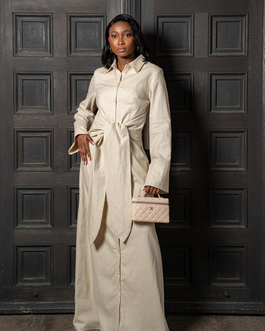 Side pockets lets you be handsfree, while full length buttons offers flexibility for you to choose. The belt can be tied from the front or the back to accentuate the waist, or just loosely knotted as an elegant detail.